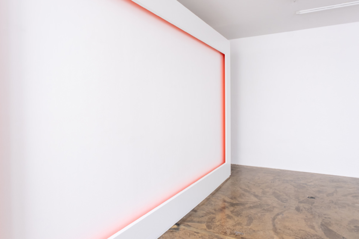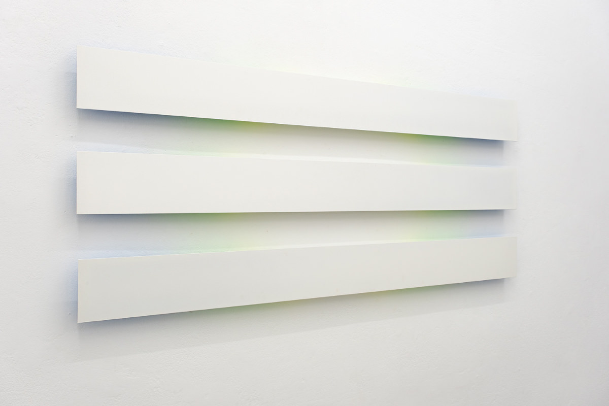 Wandskulpturen die sich in das Weiß der Wand (ebenfalls) weiß einfügen, aber abheben und Abstand nehmen. Eine Farbbeschichtung - die für Betrachter*innen nicht direkt sichtbar ist -reflektiert farbige Schatten an die Wand. Wir nehmen diesen Farbschein wahr, der sowohl mit künstlichem Raumlicht aber auch bei Tageslicht erkennbar ist.